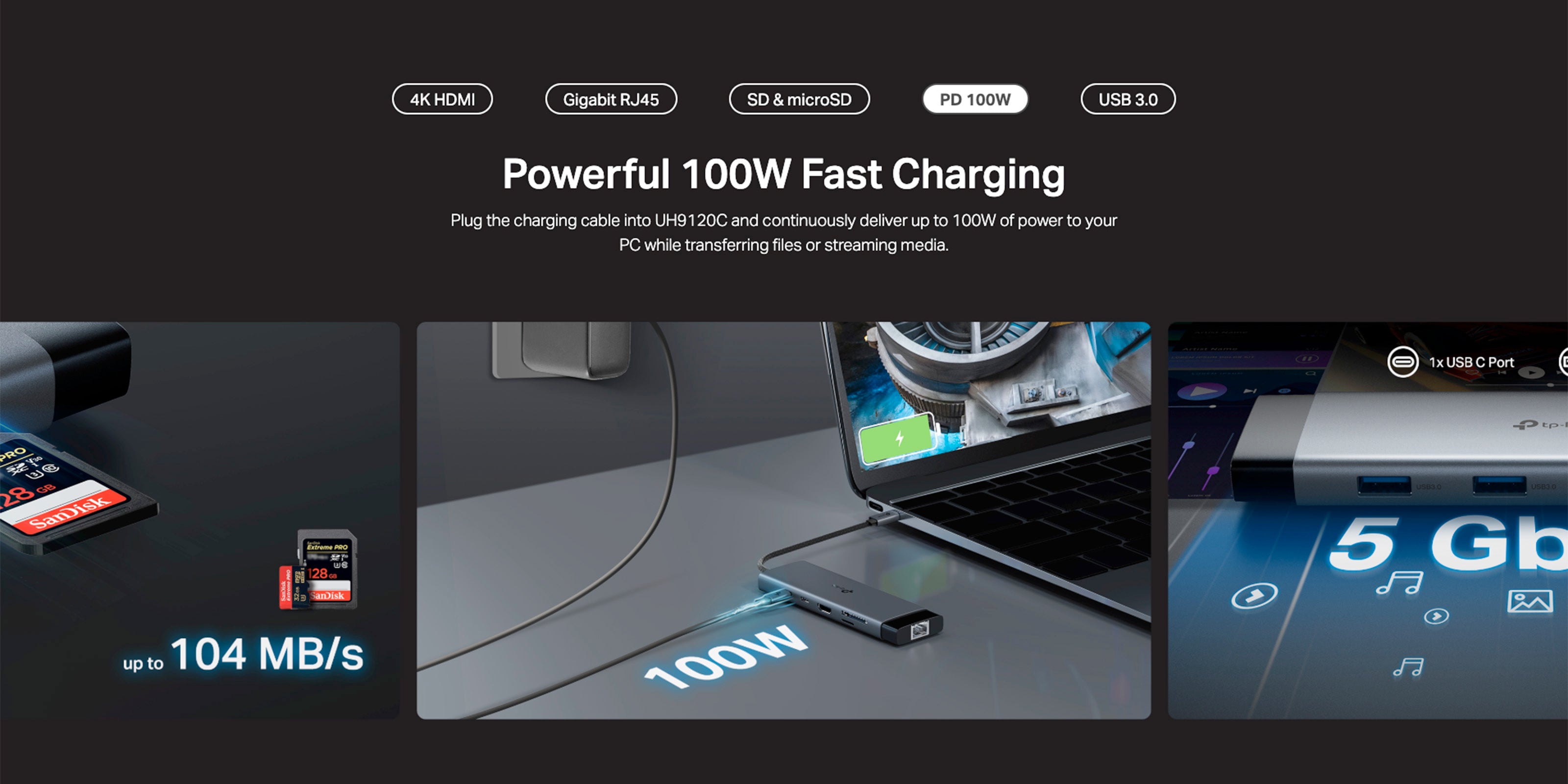 - Powerful 100W Fast Charging: Plug the charging cable into UH9120C and continuously deliver up to 100W of power to your PC while transferring files or streaming media.