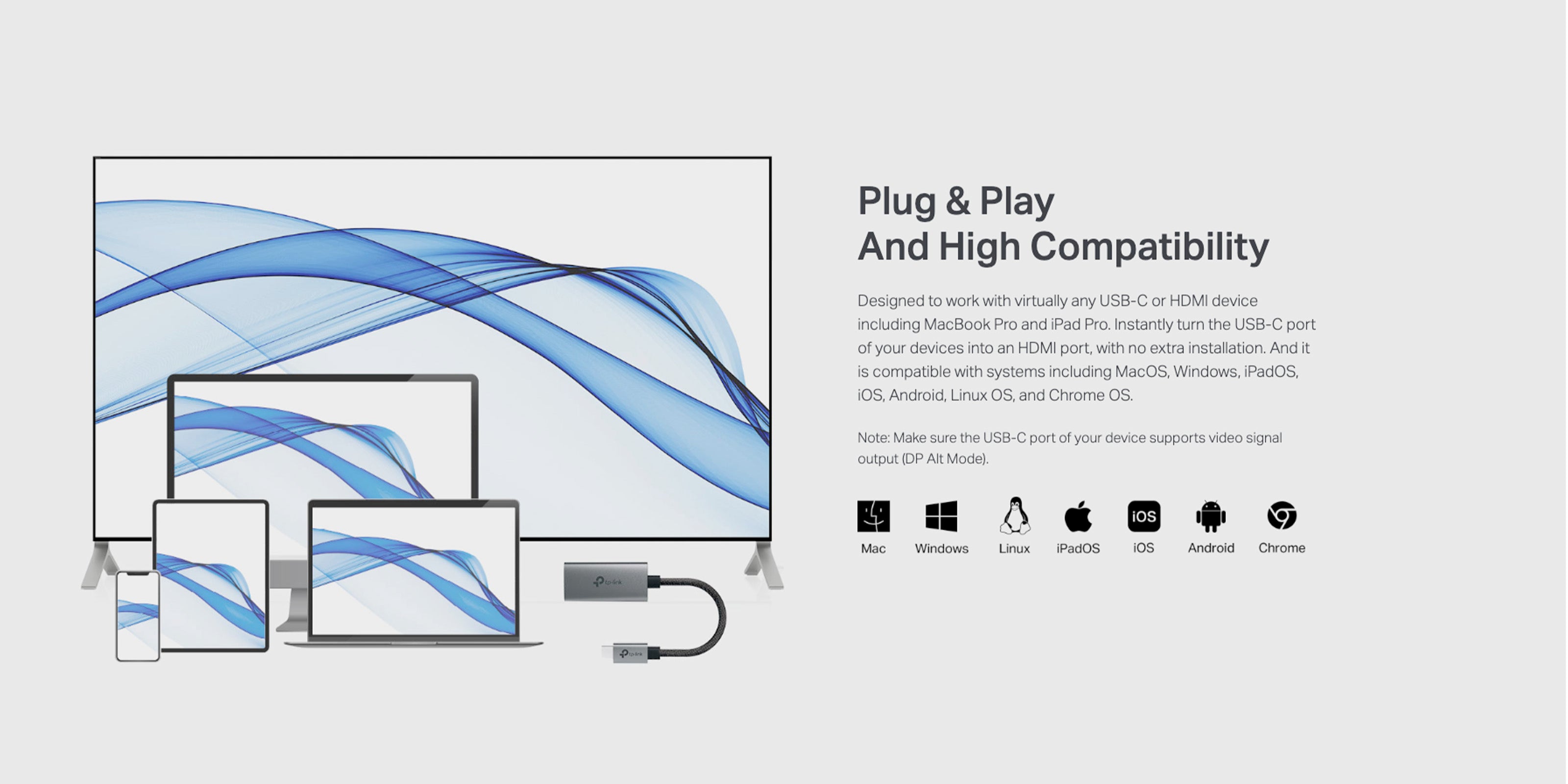 - Plug and Play: Instantly turn the USB-C port of your devices into an HDMI port, with no extra installation.